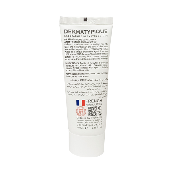 ضد آفتاب پوست قرمز و حساس درماتیپیک SPF50 با ترکیب آنتی اکسیدان آسیب ناشی از اشعه های مضر خورشید را کاهش می دهد و از پوست صورت و گردن. محافظت می کند. همچنین سیم کالمین موجود ذر این ضدآفتاب موجب کاهش فوری قرمزی، التهاب و خارش می شود.